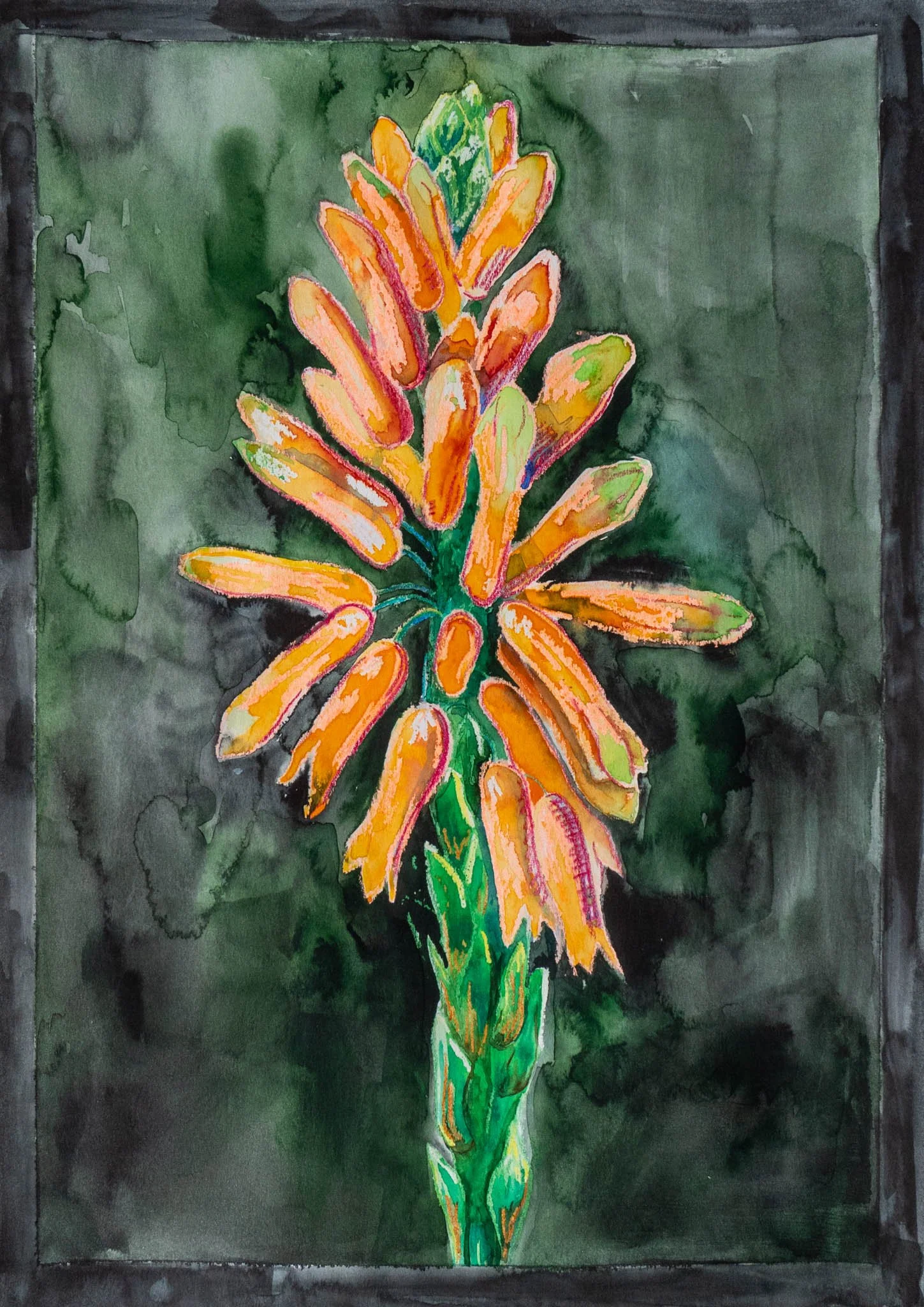 These portraits of aloes highlight the plant's resilience and healing properties. Utilizing wax crayon to resist watercolor, the aloe stands strong against shifting backgrounds that emphasize its ability to thrive in changing conditions. This contrast reinforces the aloe's connection to survival and healing, as these plants have been significant in South Africa, valued for their beauty and medicinal uses for centuries. Aloes bloom in winter. This resonates with the personal reflection in this work, which was done during a time of hardship. Both personal struggles and the broader narratives of endurance showcase how aloes symbolize hope and restoration in challenging times.